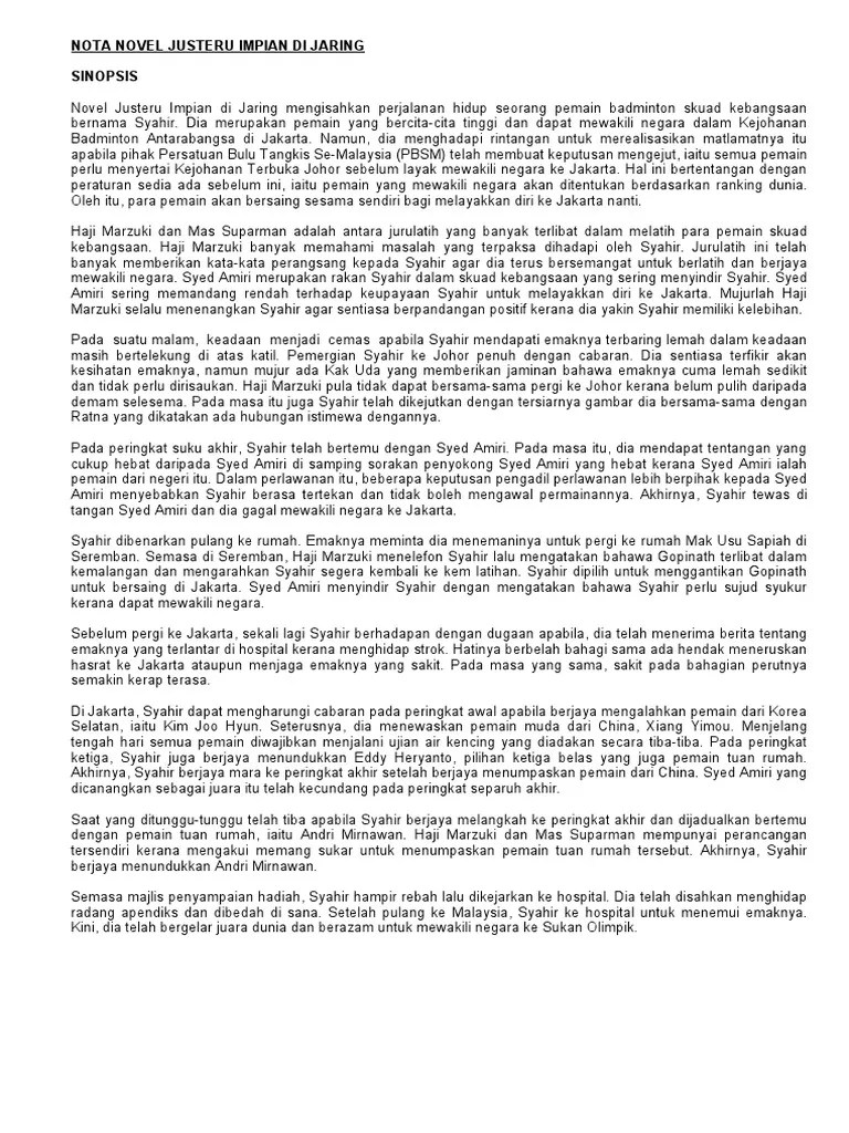 (novel bahasa melayu tingkatan 3. Memenangi melaksanakan mahu digelar pingat emas segala sebagai juara dalam sukan perintah Berikut dikongsikan nota berkaitan novel justeru impian di jaring : 3) · berdasarkan novel yang telah saya kaji di tingkatan 3 . Justeru impian di jaring 1 sinopsis keseluruhan novel ini mengisahkan cabaran yang terpaksa dihadapi oleh saya iaitu syahir seorang pemain . Sinopsis, tema, persoalan, nilai, pengajaran …. Sinopsis justeru impian di jaring bab 1 hingga bab 17. Novel justeru impian di jaring ini merangkumi nota bagi sinopsis, tema dan persoalan, watak dan perwatakan, teknik plot, plot, gaya bahasa, . Sinopsis, tema, persoalan & pengajaran. Sinopsis, tema, persoalan, nilai, pengajaran, latar tempat, latar masa, latar masyarakat, soalan + jawapan : Novel justeru impian di jaring . Turut disertakan nota berkenaan watak .