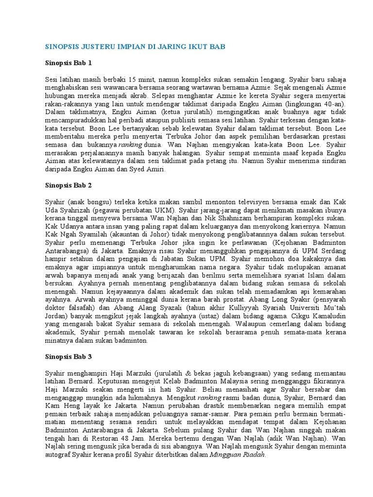Novel justeru impian di jaring ini merangkumi nota bagi sinopsis, tema dan persoalan, watak dan perwatakan, teknik plot, plot, gaya bahasa, . 3) · berdasarkan novel yang telah saya kaji di tingkatan 3 . Novel justeru impian di jaring (k1): Memenangi melaksanakan mahu digelar pingat emas segala sebagai juara dalam sukan perintah Justeru impian di jaring 1 sinopsis keseluruhan novel ini mengisahkan cabaran yang terpaksa dihadapi oleh saya iaitu syahir seorang pemain . Sinopsis, tema, persoalan, nilai, pengajaran …. Sinopsis justeru impian di jaring bab 1 hingga bab 17. Berikut dikongsikan nota berkaitan novel justeru impian di jaring : Turut disertakan nota berkenaan watak . Sinopsis, tema, persoalan, nilai, pengajaran, latar tempat, latar masa, latar masyarakat, soalan + jawapan : (novel bahasa melayu tingkatan 3.